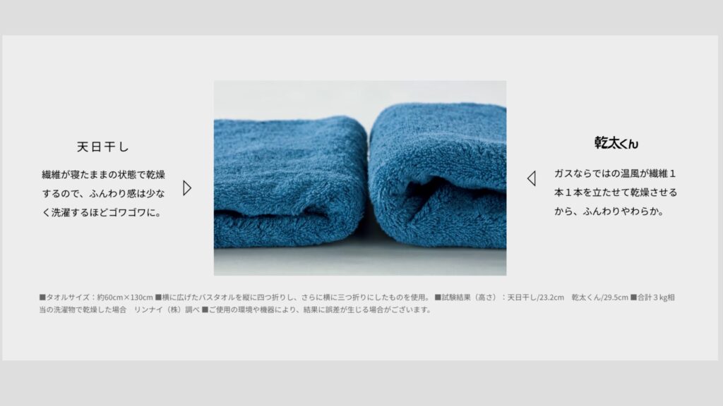 リンナイの実験データによると、同じタオルを乾燥させた場合の厚みは: